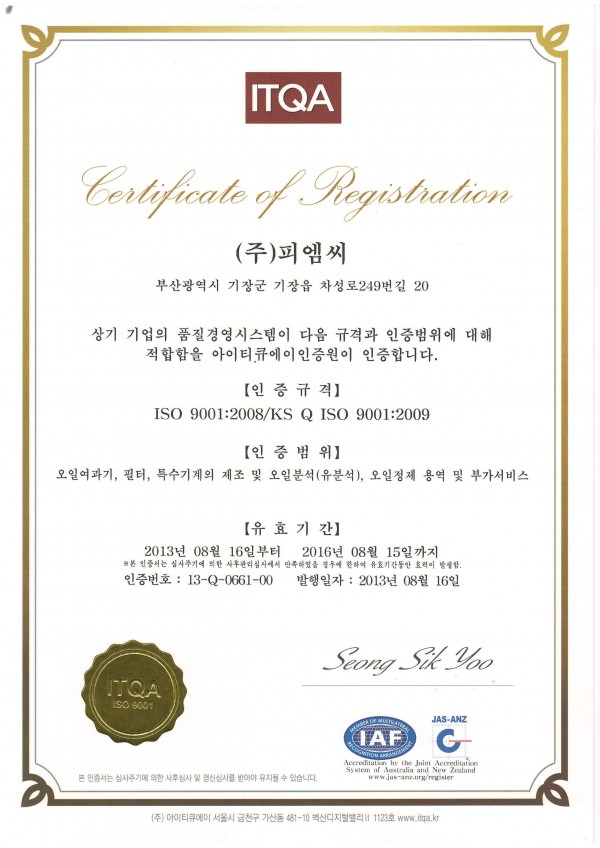 (주)피엠씨 ISO 9001:2008/KS Q ISO 9001:2009 인증 페이지 정보 작성자 최고관리자 작성일15-12-03 09:27 조회5,161회 댓글0건 관련링크 이전글 목록 본문 인증범위 :오일여과기,필터,특수기계의 제조 및 오일분석(유분석),오일정제 용역 및 부가서비스 댓글목록 등록된 댓글이 없습니다. 이전글 목록